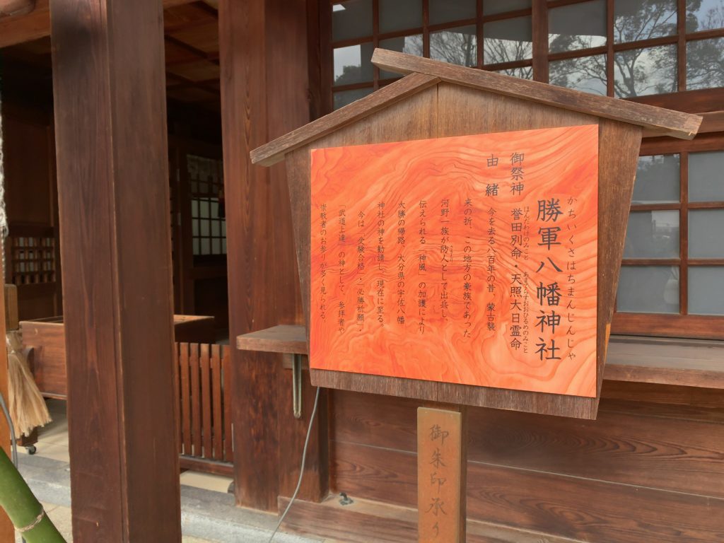 階段を降りて左手には勝軍八幡神社があり受験合格などの参拝ができます。受験生は必見です。