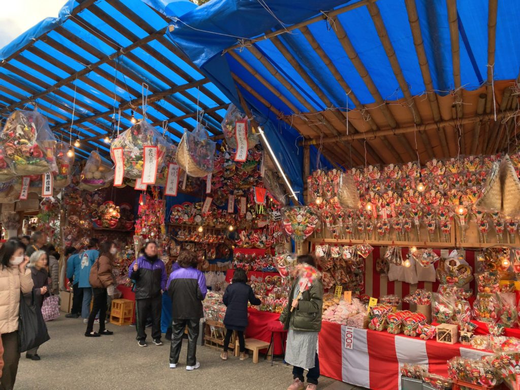 椿神社入口には熊手やお守りが購入できる大きなコーナーも設置されています。自宅用の小ぶりな物から企業用の大きな物まで幅広く縁起物が揃っています。椿さんと言えばやっぱりこの景色が風物詩ですね。