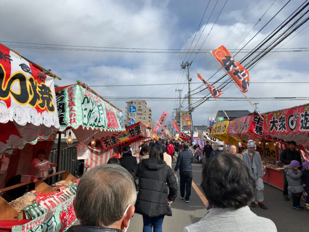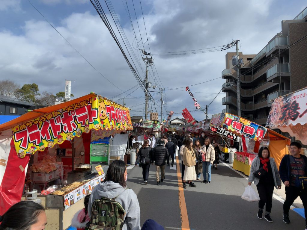 はなみずき通りから久米垣生線に入ってすぐのところですがここから出店が並んでいます。距離にすると2キロ近くあると思うのですが、その間出店が並びまさに圧巻で愛媛県でも最大級の出店数ではないかと思います。