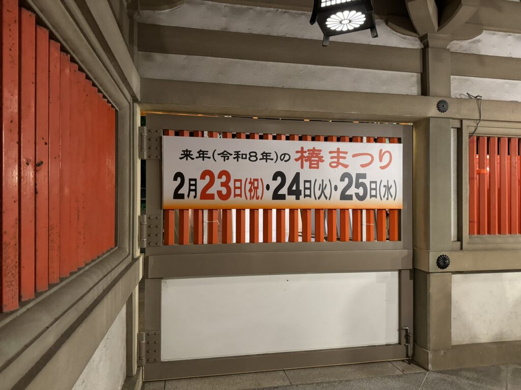 令和8年の椿まつりの開催日をいち早くチェックする方法があり、実は椿神社の境内に来年の椿まつり開催時期が表示されているのでこちらも要チェックです。