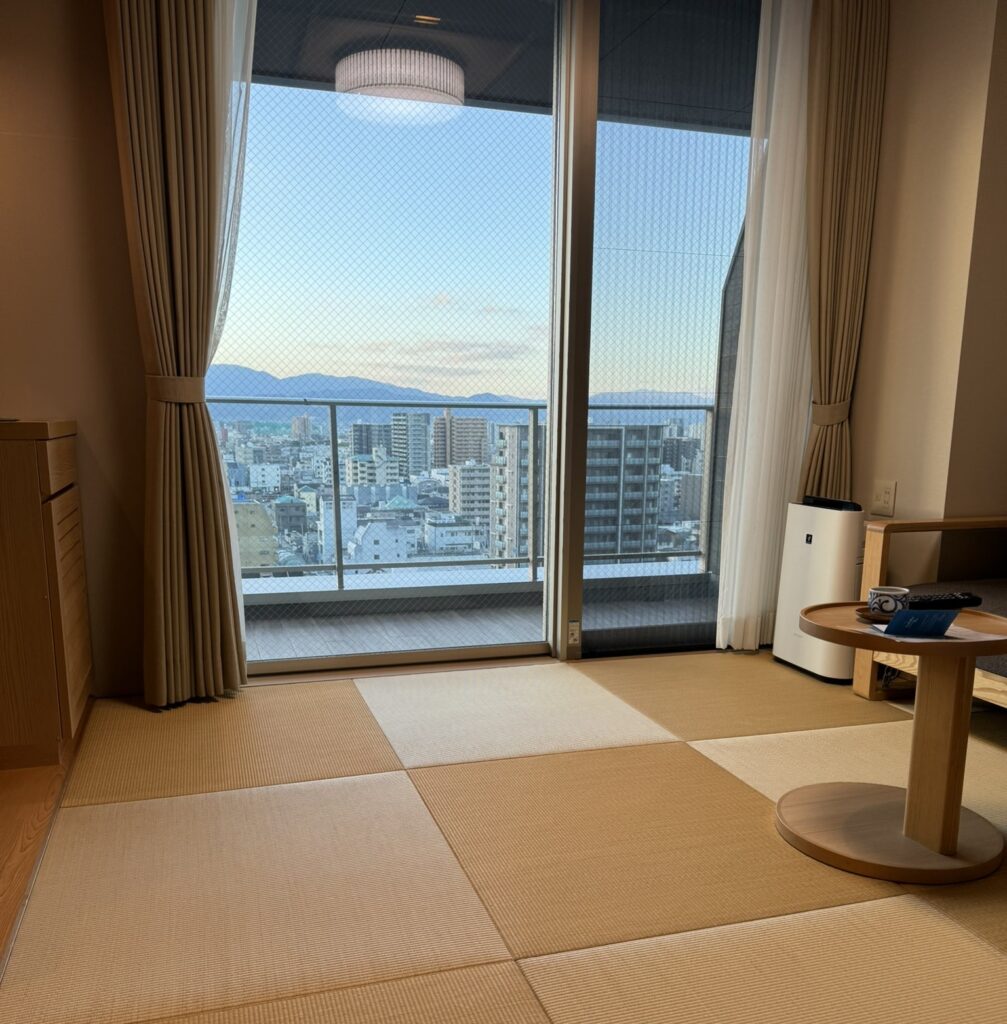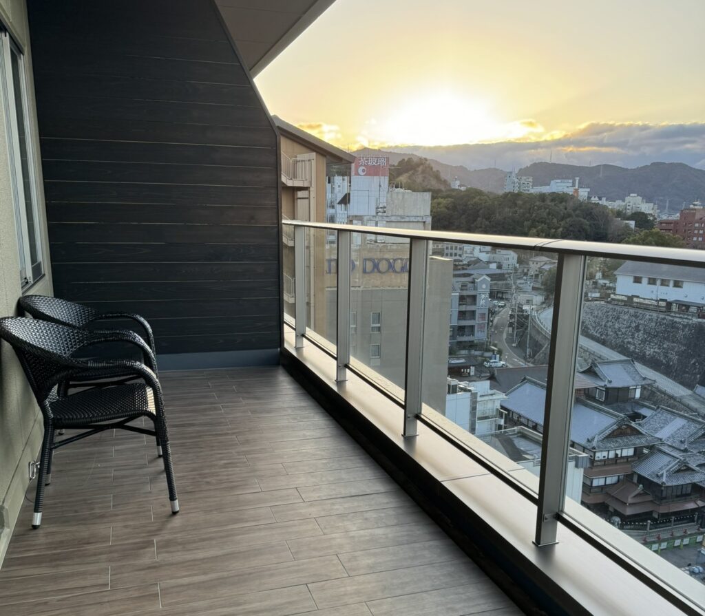 客室の部屋にもよりますが、窓から松山市内の街並みを一望することができました。バルコニーには椅子もあるのでお酒を飲みながらゆっくり景色や夜景を眺めながらゆっくりとした時間を過ごすのもおすすめですね。