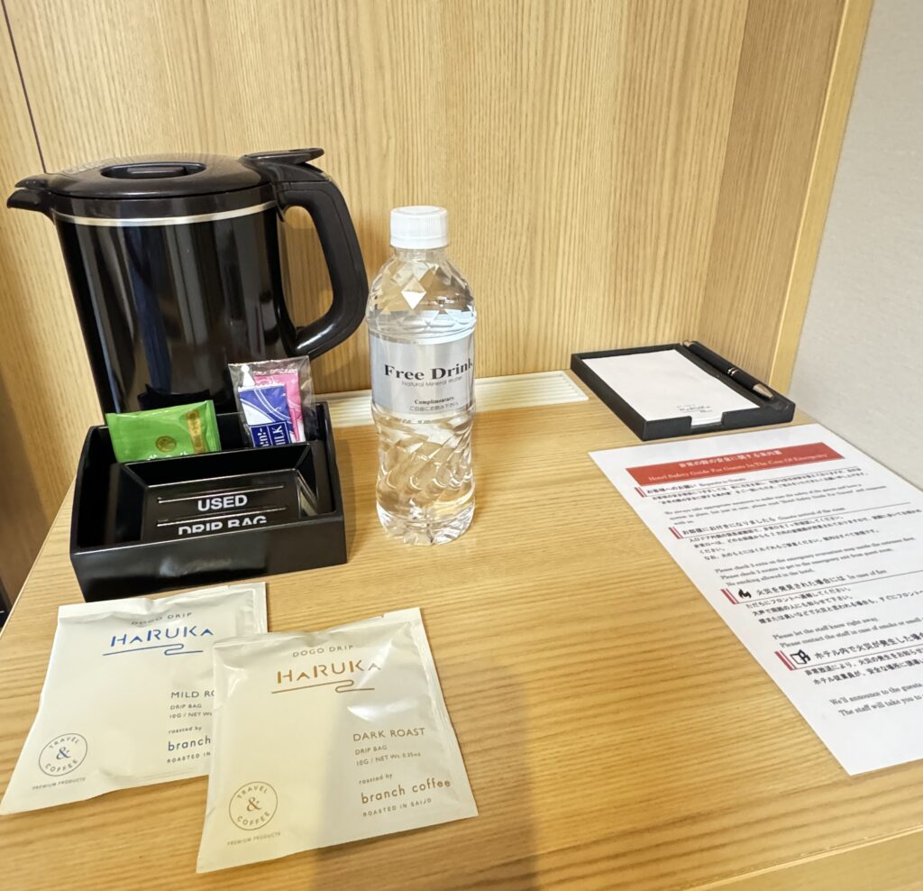 客室に入ると電気ケトル、お水やコーヒーなど一通りのものは揃っている感じです。