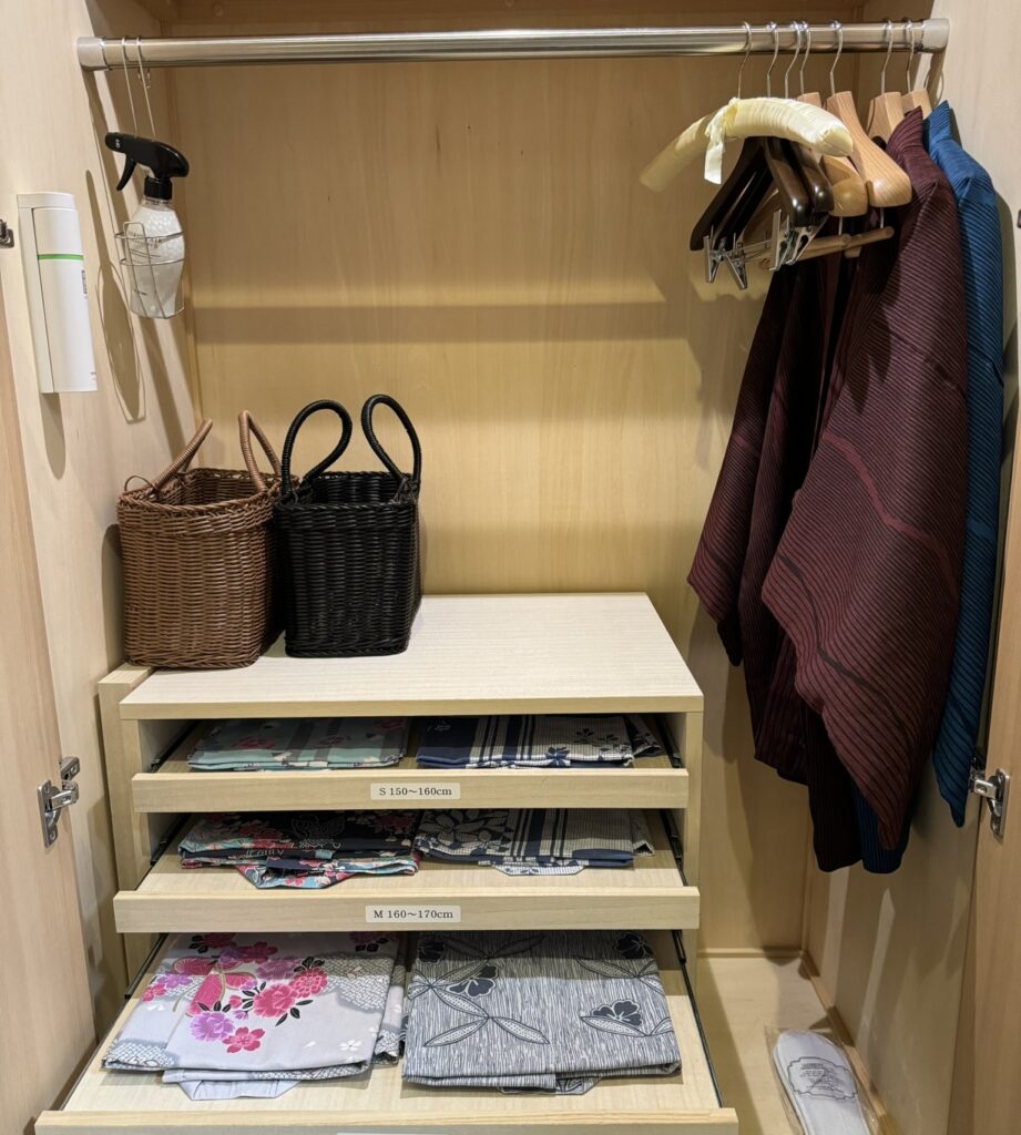 クローゼットの中には浴衣やスリッパ、手持ち用のかごがあり、サイズも一目で分かるようにセッティングしてあるので分かりやすかったです。