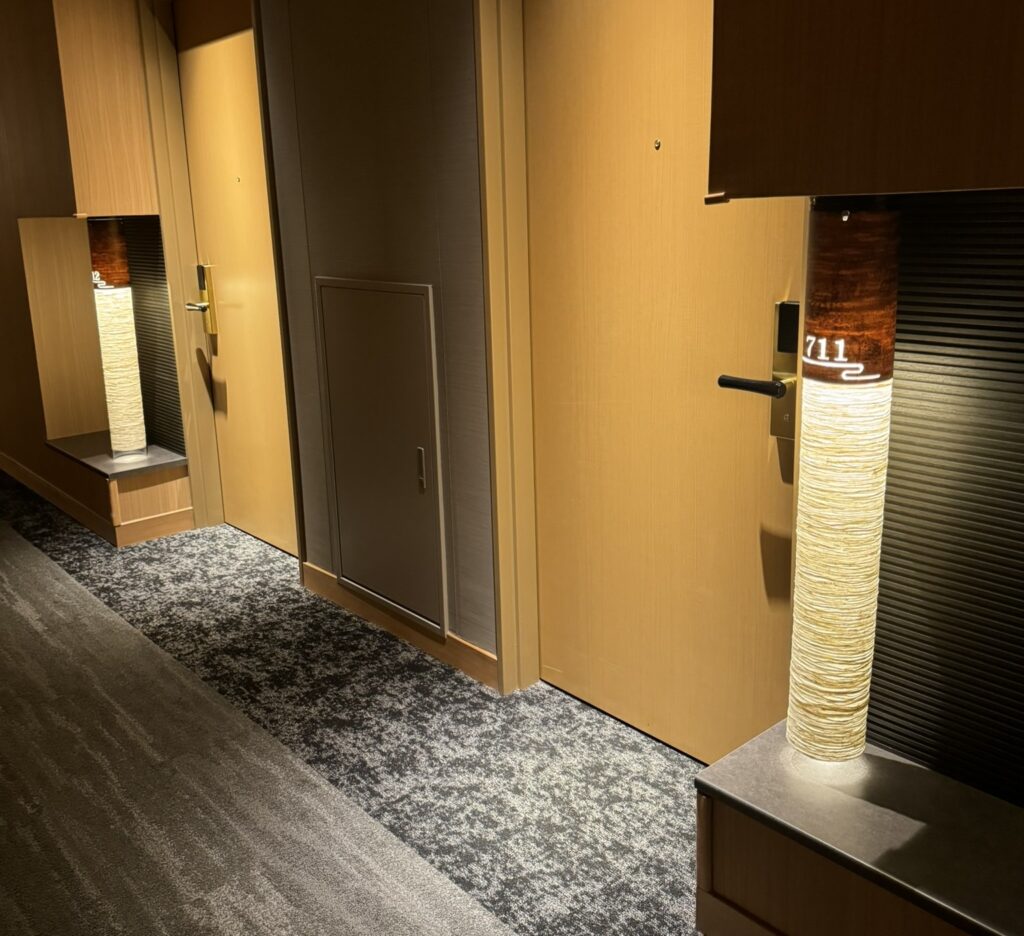 廊下には絨毯が敷かれ清潔感と高級感のある雰囲気で、入口には部屋番号の書かれたおしゃれな照明で大人な雰囲気です。