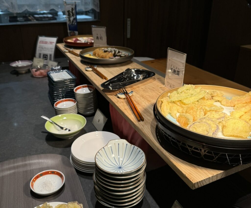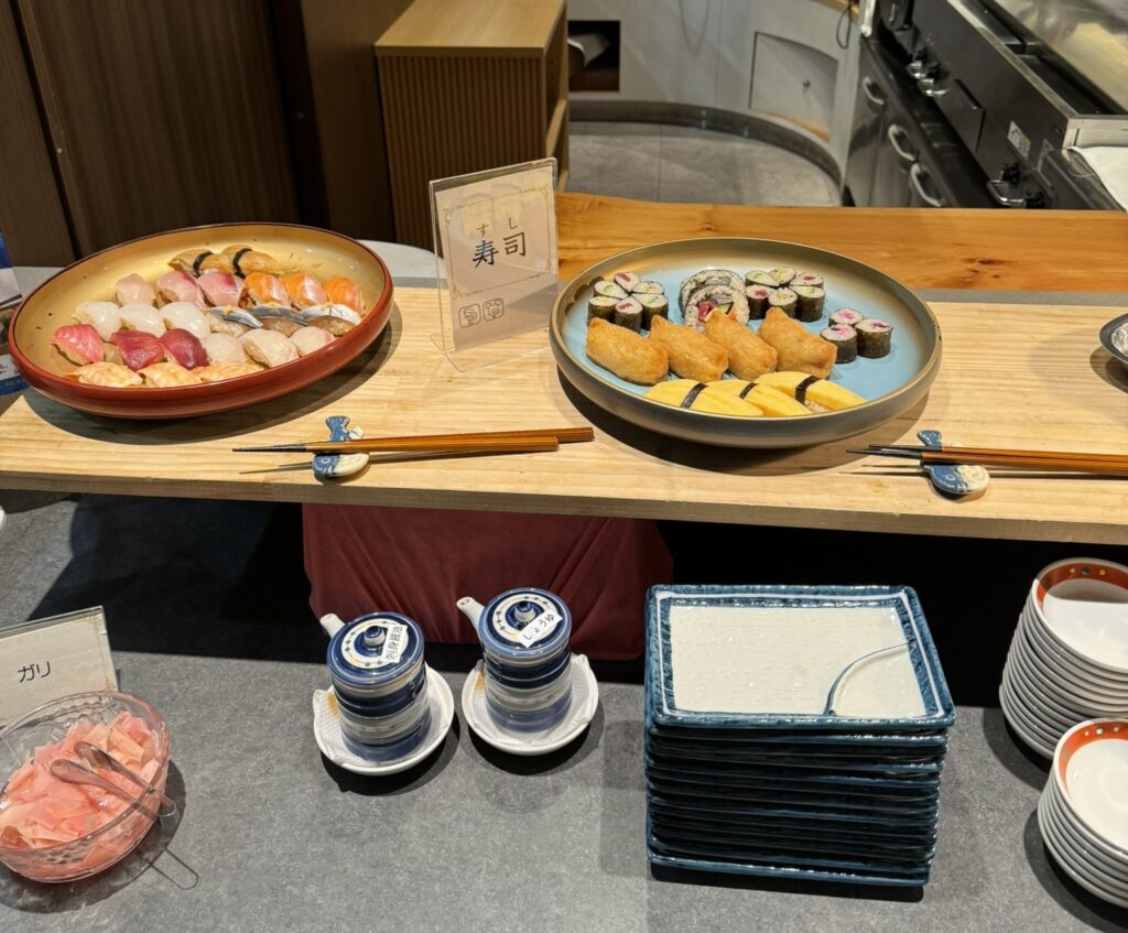 夕食はビュッフェ形式でとにかく豪華!お寿司や揚げ物、お刺身など食べたい物が何でもそろっています。