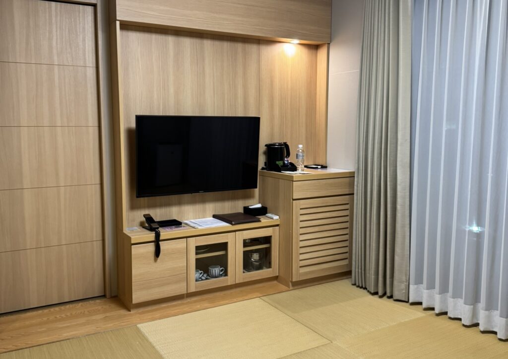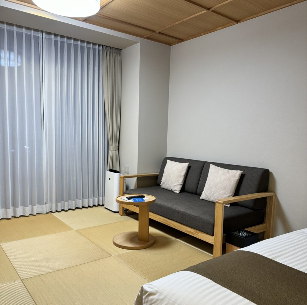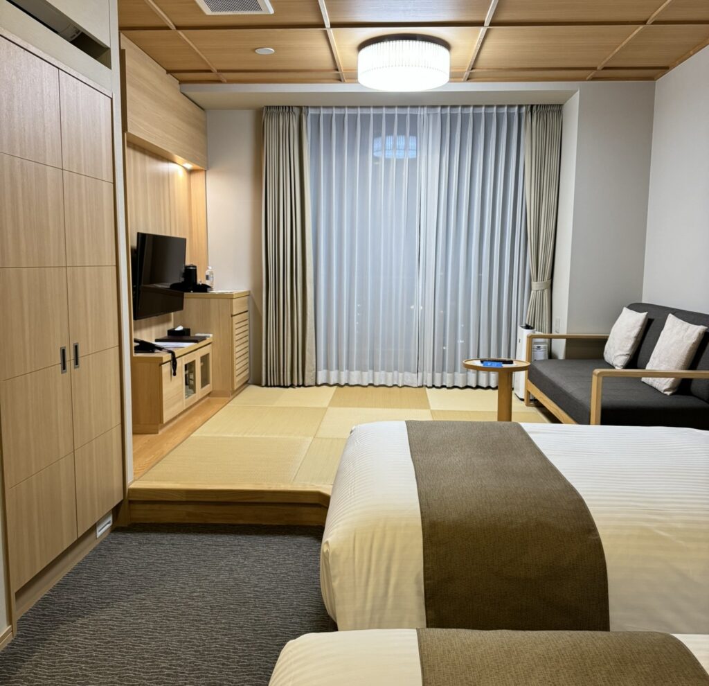 客室全体はこんな感じです。奥が広くベッドと畳のスペースが区分けされておりレイアウトが絶妙に良いです。リラックスできる広さや空間が考えられている気がします。