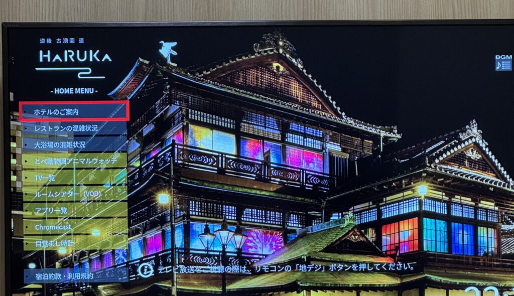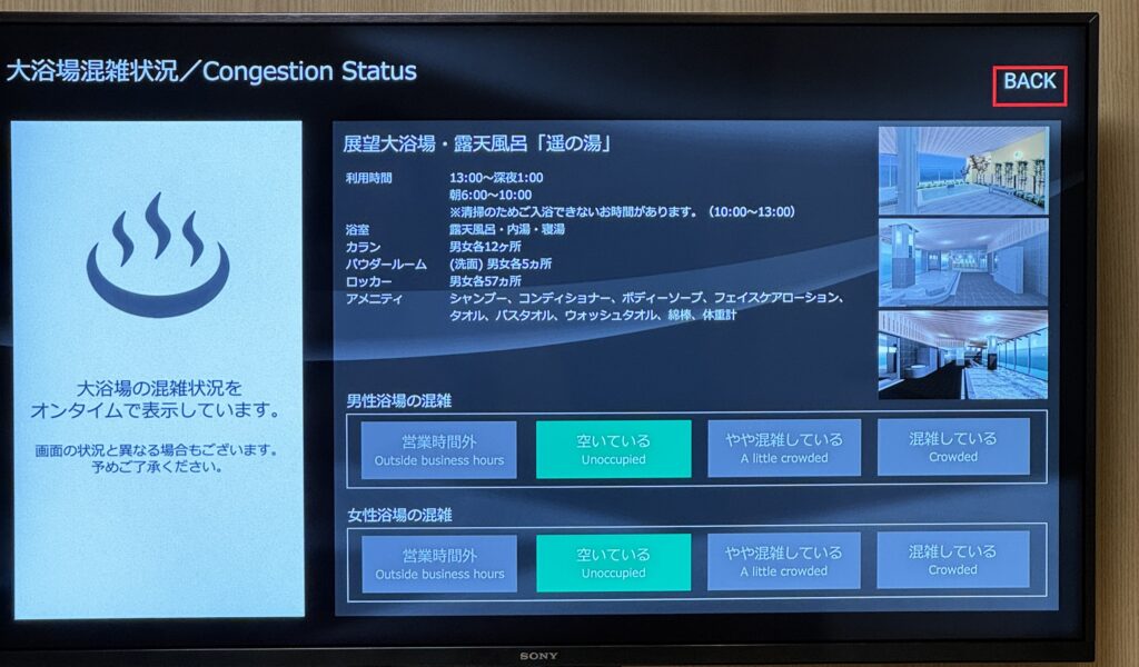 遥でのサービスでいいなと思ったのが、大浴場の混雑状況を客室のテレビ画面から確認できるというシステムです。また、レストランの混雑状況もチェックできるので人混みを避けたい時に助かりました。